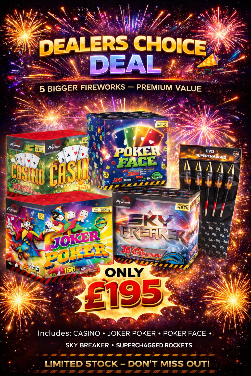 Here we have one of our fantastic £195 firework deal consisting of the following items.  Its ideal for any garden party.  Ideal party starter set something for everyone to enjoy.