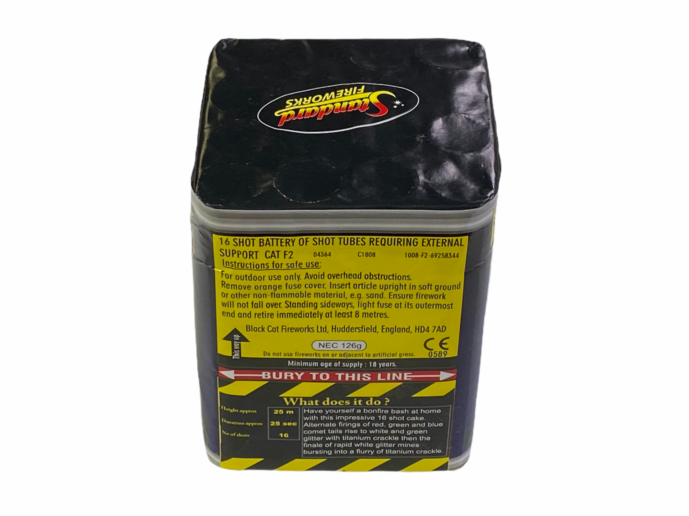 A 16 shot cake with alternate firing effects of red, green and blue comet tails rise to white and green glitter with titanium crackle. Then the finale of rapid white glitter mines bursting into a flurry of titanium crackle.